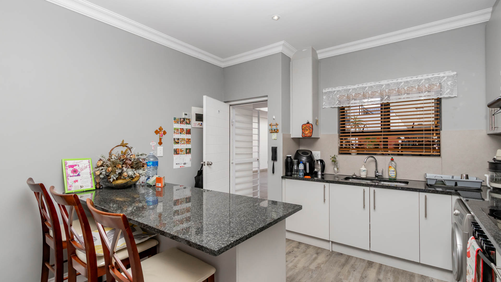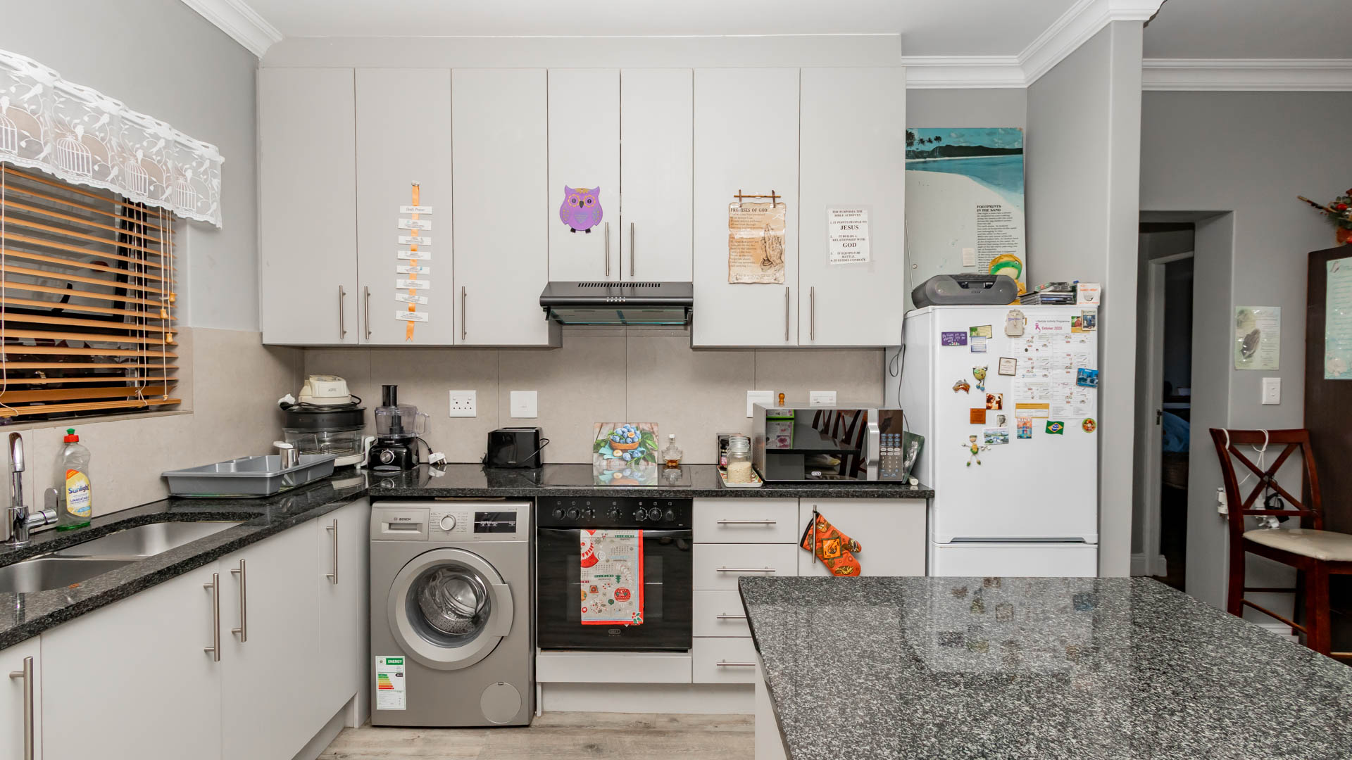 Modern kitchen with granite counter tops, built in stove, oven and extractor fan and plumbing for 2 appliances.